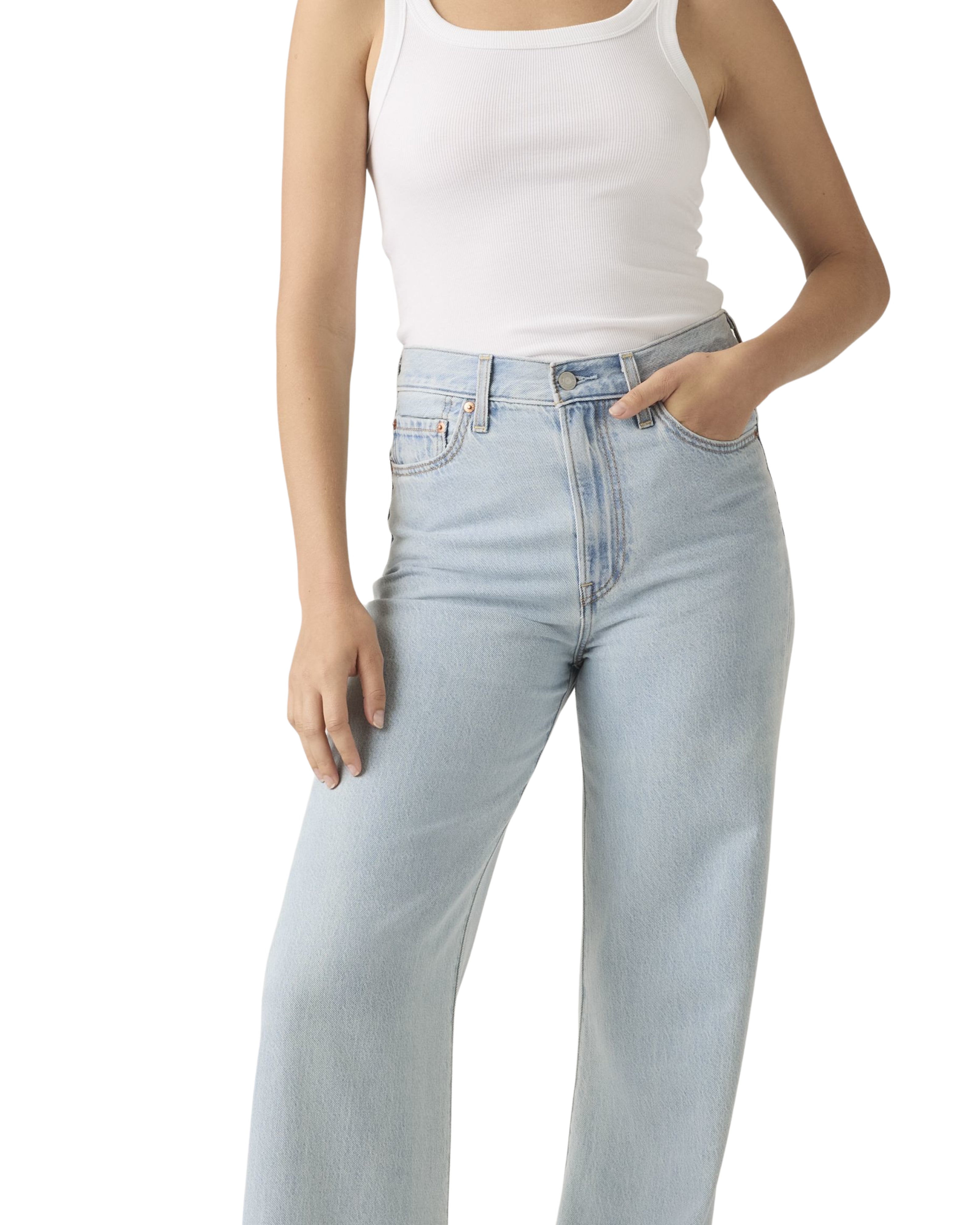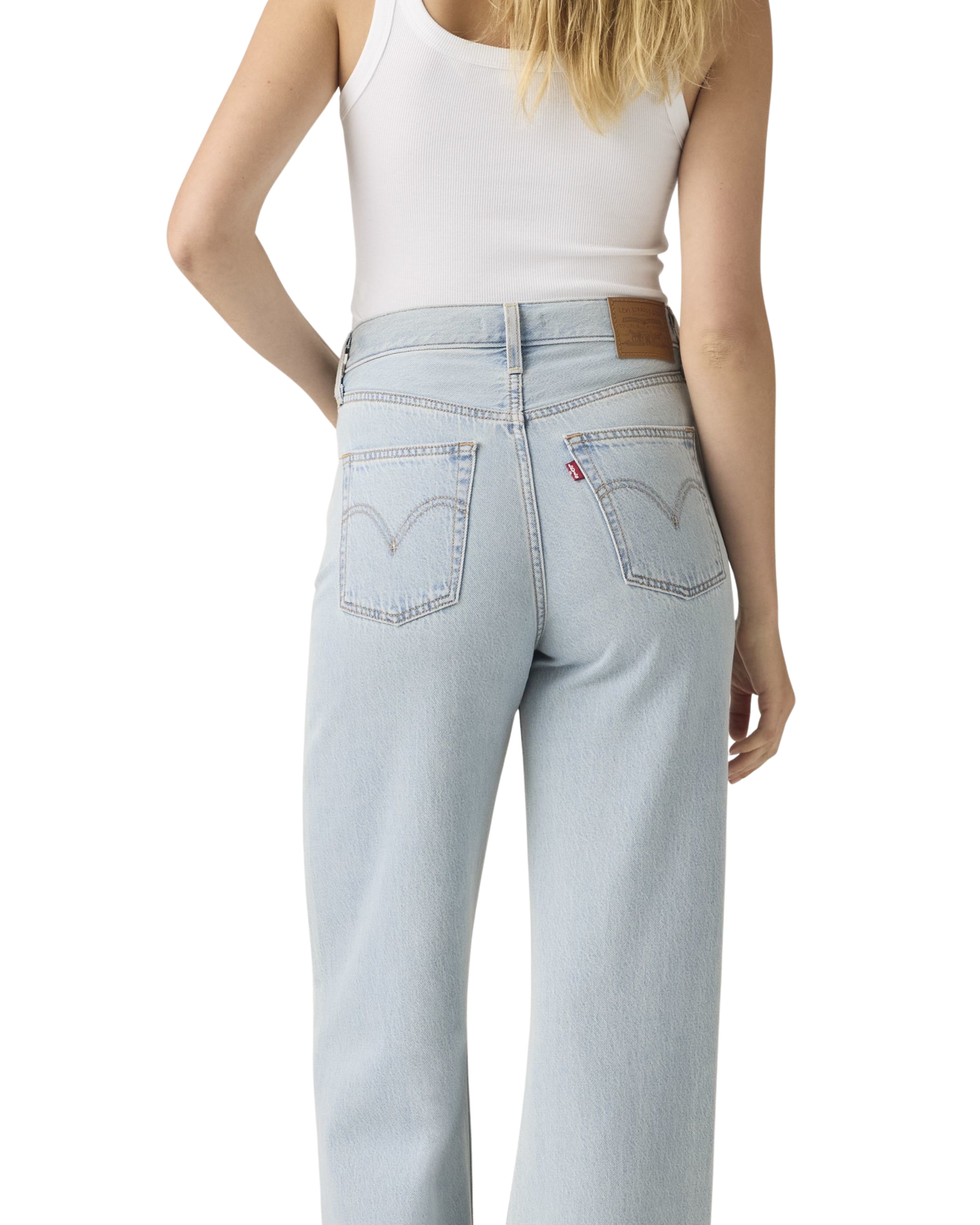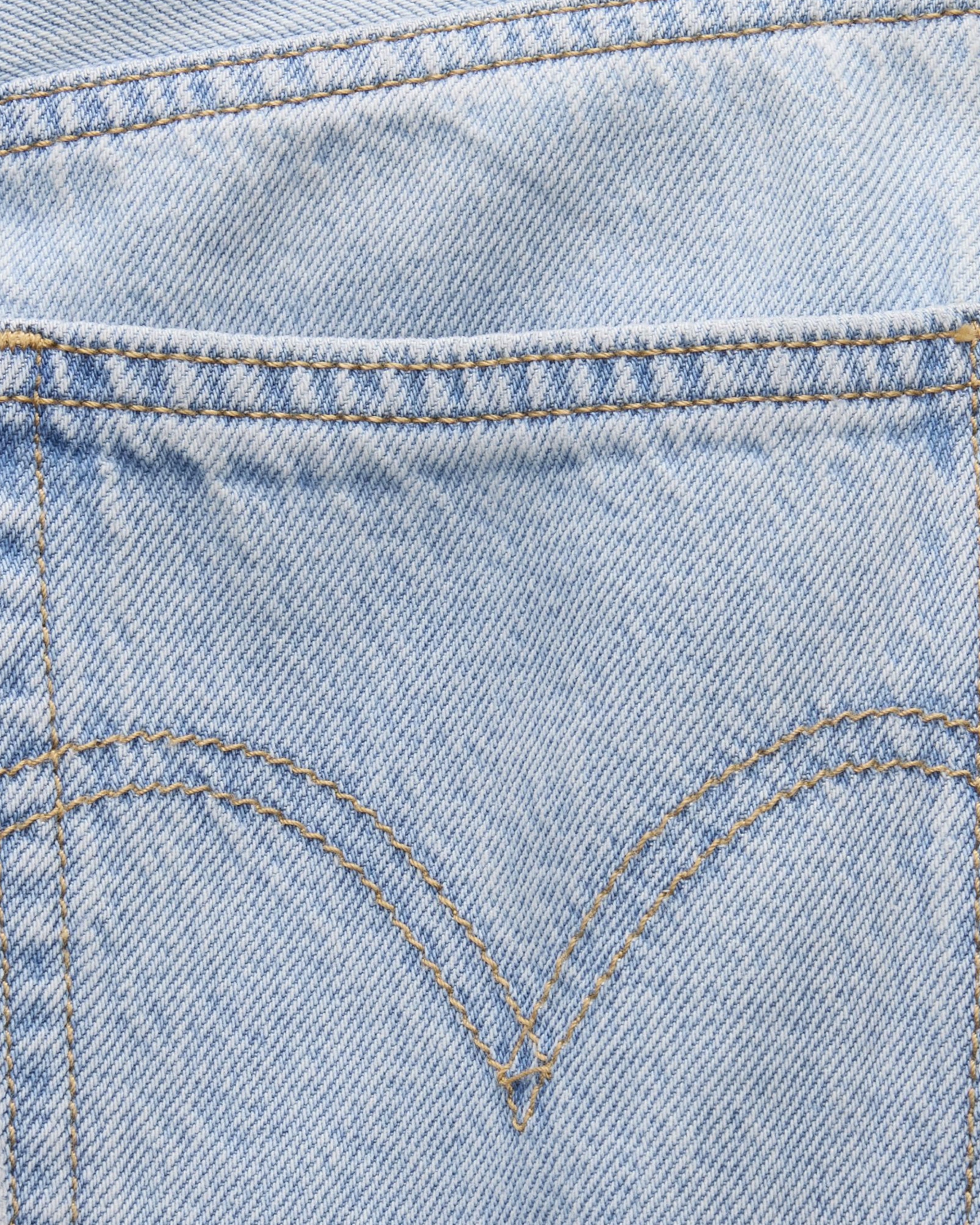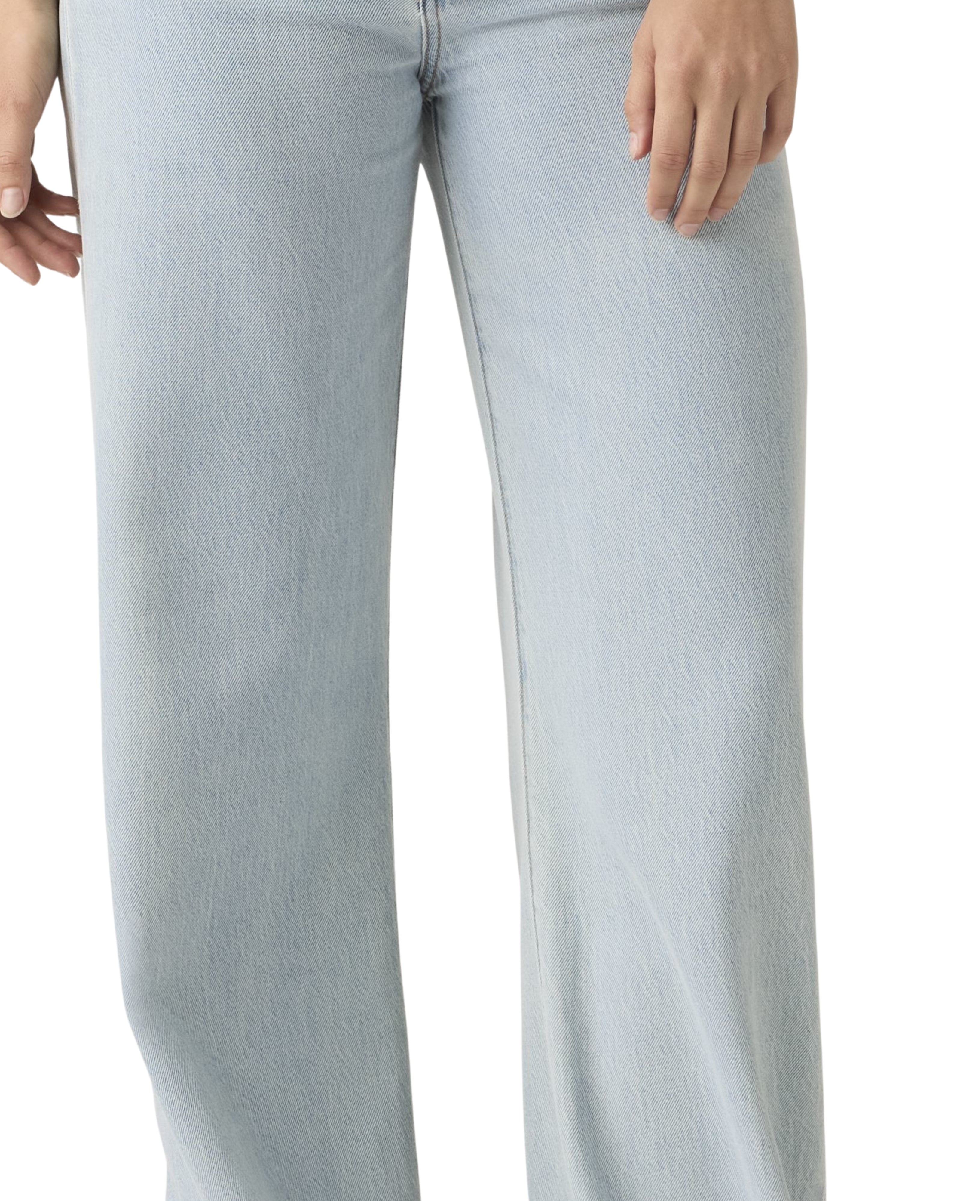Questi jeans presentano un taglio a gamba larga (wide leg) estremamente lineare e moderno, caratterizzato da un lavaggio azzurro chiarissimo, quasi tendente al bianco. Il denim ha una colorazione molto uniforme e luminosa, priva di vistose sbiaditure o effetti usurati, il che conferisce al capo un'estetica pulita e minimale. La struttura della gamba scende ampia e dritta direttamente dal bacino, mentre le cuciture tono su tono e la trama diagonale del tessuto sono appena visibili, mantenendo uno stile sobrio ideale per outfit primaverili o estivi.