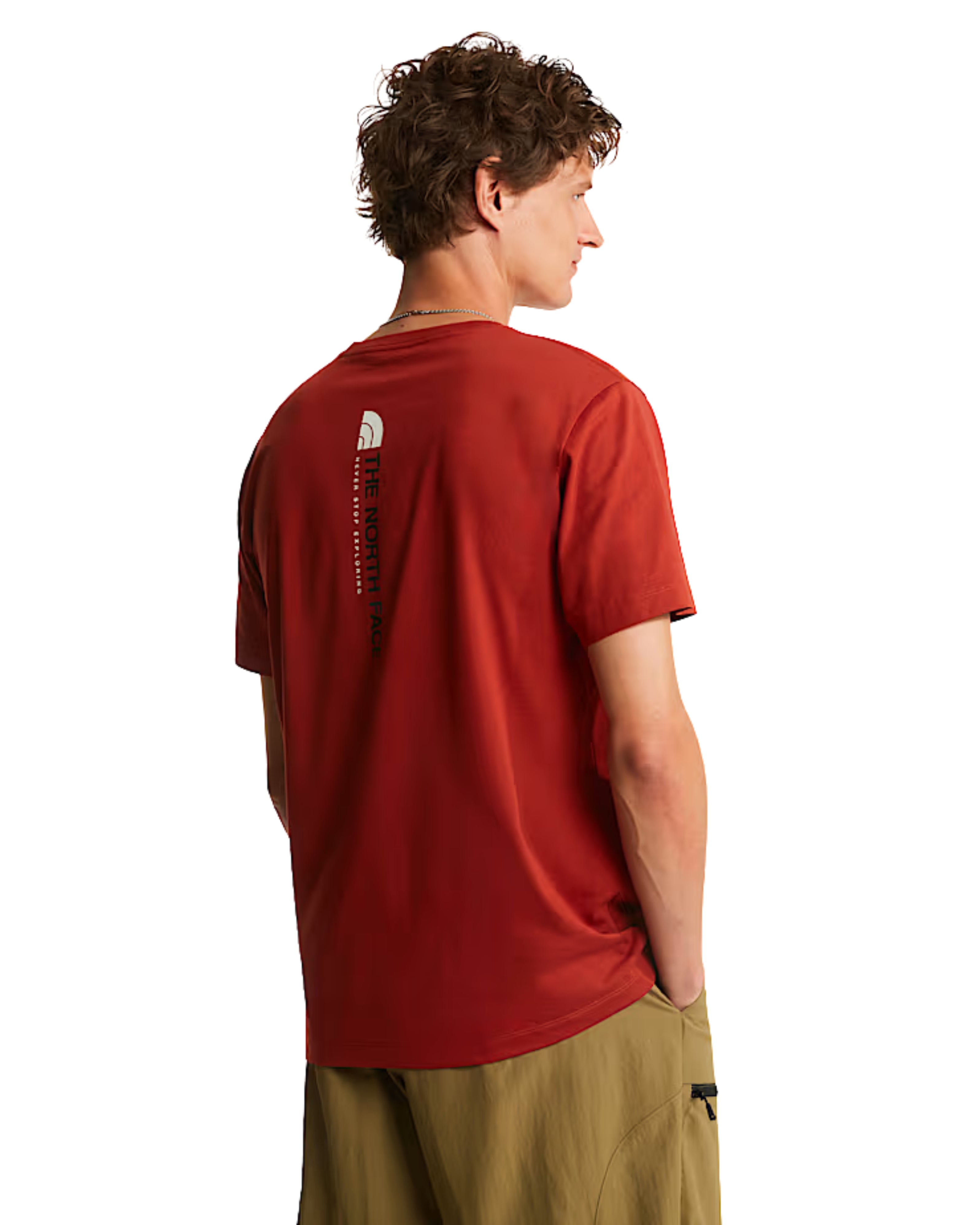 Questa t-shirt a maniche corte di The North Face si distingue per la sua intensa tonalità rosso ruggine, che conferisce al capo un carattere deciso e outdoor. La struttura presenta una vestibilità classica con un girocollo rifinito, realizzata in un tessuto leggero che mostra una delicata trama naturale.